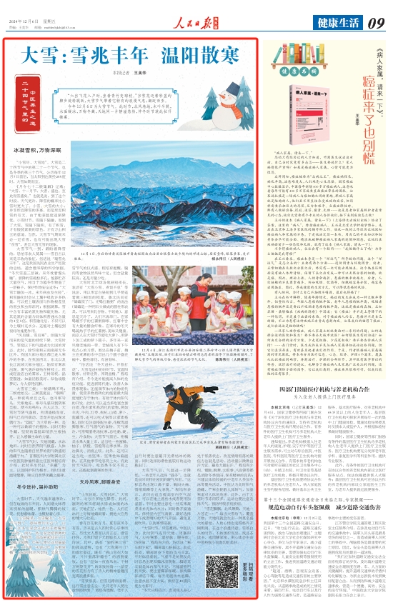 “雪花飘飘,北风萧萧,天地一片苍茫……”每当大雪纷飞,覆盖万物,天地间就会生出一种莫名盛大的感觉,人的心情也变得格外开阔明朗。在这个浪漫诗意、雪落白头的时节,不妨围炉而坐,或品茶读书,或闲聊家常,用心体会生命中那些细小而真切的美好。(记者 王美华)