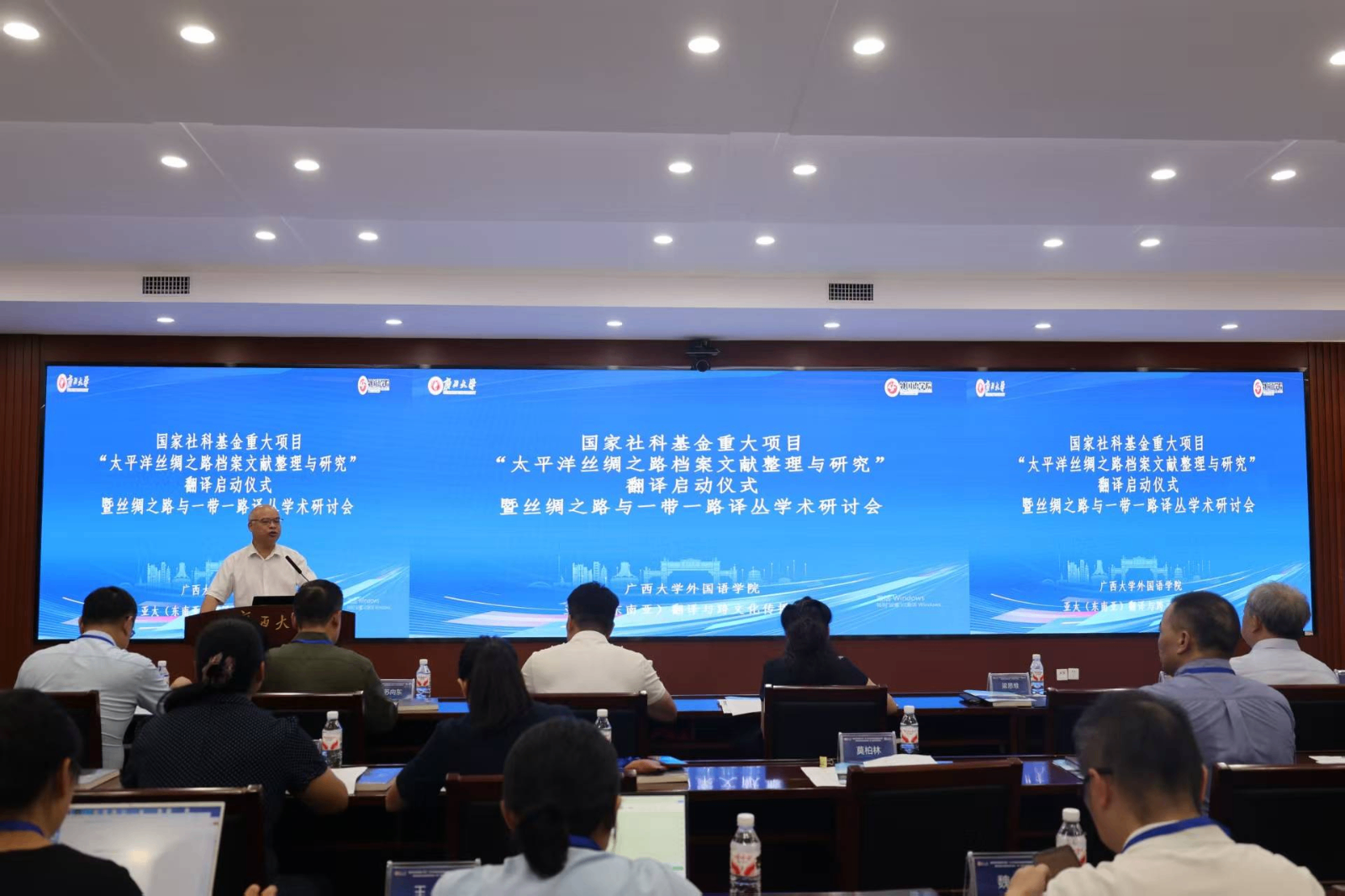 9月13日,国家社科基金重大项目“太平洋丝绸之路档案文献整理与研究”翻译启动仪式暨“丝绸之路”与“一带一路”译丛学术研讨会在广西大学举行。会议由广西大学外国语学院、四川师范大学革命文献研究院、重庆出版社,以及北京外国语大学国际中国文化研究院等单位联合主办,广西高校人文社会科学重点研究基地亚太(东南亚)翻译与跨文化传播中心承办,来自南京大学、四川大学、中南大学、北京外国语大学、外交学院等十余所高校以及出版届的40余位专家学者参会。