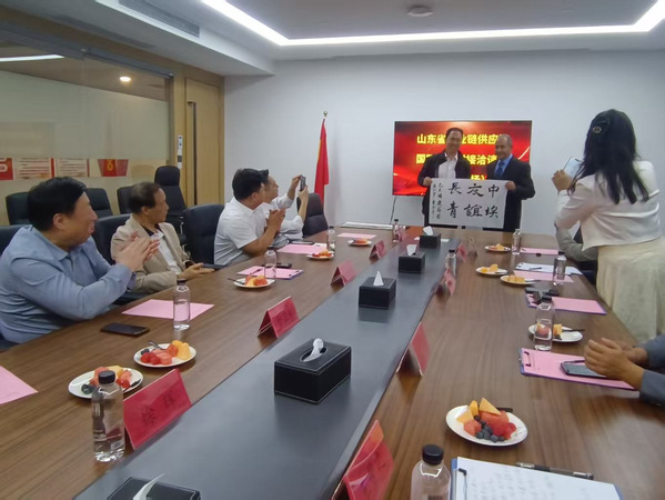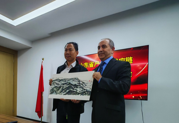 王豐之向穆罕麦德·优瑟夫赠送“中埃友谊长青”书法与“齐鲁青未了”国画两幅文化礼品。书法作品以笔墨传递两国世代友好的诚挚期许,国画则借岱岳旭日、齐鲁大地的生机意境,展现中国传统文化魅力与对中埃两国国泰民安、合作绵长的美好祝愿。