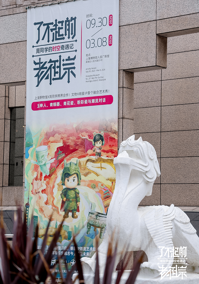 “那些沉睡在博物馆里的玉器、青铜器、青花瓷与粉彩瓷器,不仅是文明的印记,更是老祖宗留给我们的智慧与温度。”上海市文化和旅游局党组成员、上海博物馆馆长褚晓波表示,这一次,上海博物馆尝试用一种更年轻的方式与它们相遇——让上海博物馆的珍宝,与“周同学”的潮流想象力展开一场跨时空的对话。