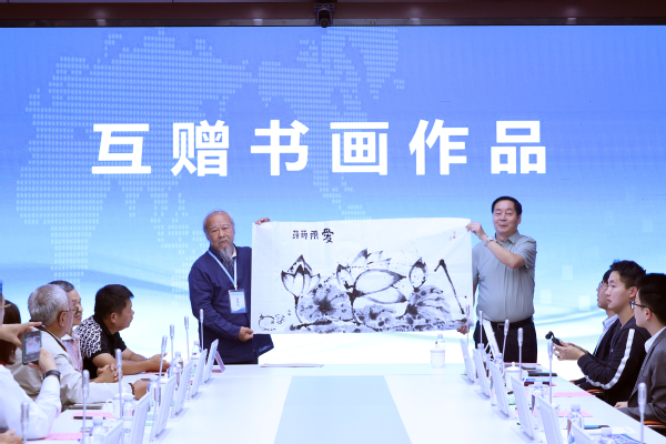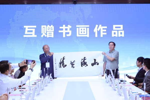 会上,双方还举行了书画互赠仪式。台胞团团长、台湾鸿儒窑窑主、苗栗陶青年创意协会顾问许柏彦先生向学校赠送亲笔画作,以艺术传递深厚情谊;徐东升代表学校回赠了由常务校长刘先义创作的书法作品。笔墨丹青间,寄托着对两岸关系美好未来的诚挚祝愿,生动诠释了“两岸一家亲”的文化纽带。