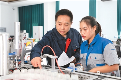 老师辅导王小文(右)进行颗粒装填单元气路调试。