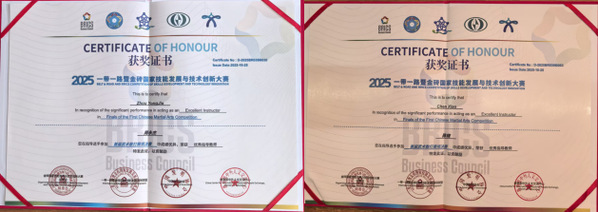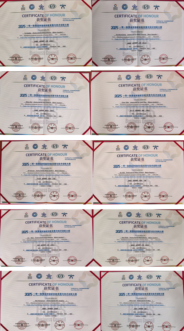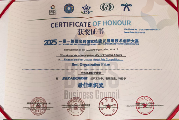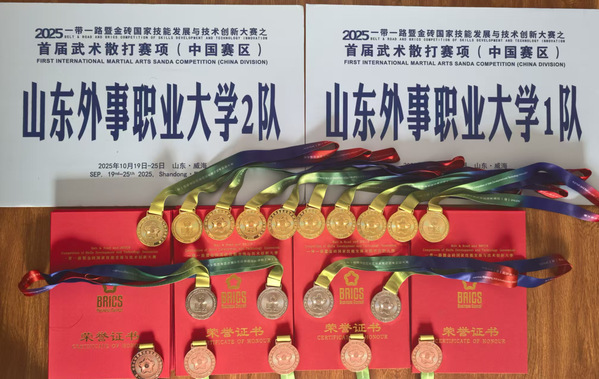 10月19日至25日,2025一带一路暨金砖国家技能发展与技术创新大赛之首届武术散打赛项在山东外事职业大学威海校区圆满收官。山东外事职业大学组织两支代表队,共21名选手出征赛场。比赛中,山外大学子充分发扬“见红旗就抗、见第一就争”的拼搏精神,敢打敢拼、不惧强手,在武术散打、武术套路、中国式摔跤三大项目中斩获颇丰,共收获金牌10枚(一等奖)、银牌4枚(二等奖)、铜牌5枚(三等奖)及优秀奖2项。教练员周永杰、王君水、王闯、陈晓凭借出色的指导水平荣获“优秀指导教师”称号,学校亦凭借卓越的组织保障工作,一举斩获大会颁发的“突出贡献奖”“最佳组织奖”两项荣誉。