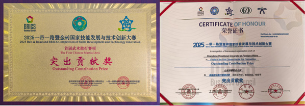 本次比赛由金砖国家工商理事会中方理事会、一带一路暨金砖国家技能发展国际联盟、一带一路暨金砖国家技能发展与技术创新培训中心、中国发明协会、教育部中外人文交流中心联合主办,金砖国家工商理事会技能发展、应用技术与创新中方工作组与山东外事职业大学联合承办,山东省武术院技术指导,菏泽学院、山东中武道文化传播有限公司协办。
