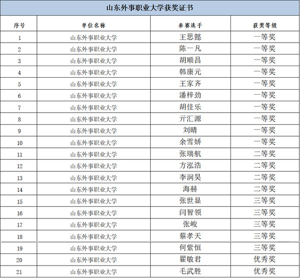山东外事职业大学获奖证书