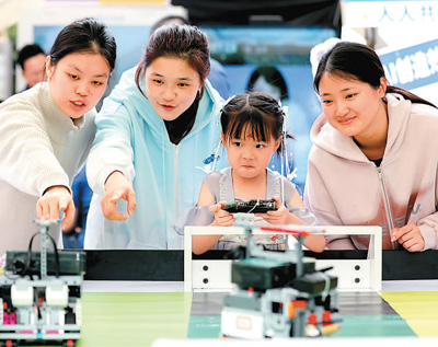 4月28日,在福建省福州市鼓楼区鼓东街道冶山春秋园,小朋友正在体验足球机器人。