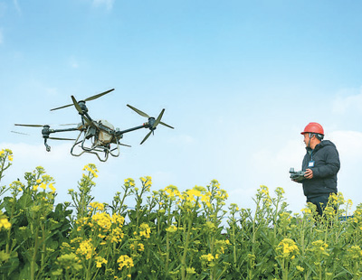 3月6日,江苏省南通市通州区刘桥镇无人农机示范基地,种植户在田间操控调试植保无人机。