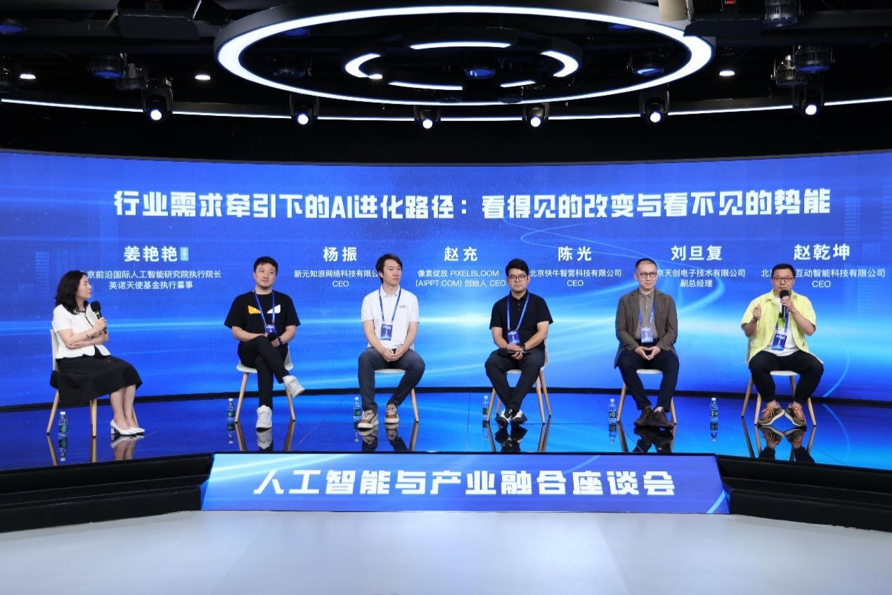 围绕“行业需求牵引下的AI进化路径:看得见的改变与看不见的势能”议题,在北京前沿国际人工智能研究院执行院长,英诺天使基金执行董事姜艳艳主持下,多位与会嘉宾在圆桌论坛环节对行业未来表达思考与展望。北京快牛智营陈光表示,人工智能深度嵌入跨境运营全链路,成为降低成本和缩小地区差异的新生产要素。像素绽放赵充介绍,人工智能通过用户画像建模与算法推荐技术,已应用于党政机关、企业、教育等多领域深度场景。新元知浪杨振表示,人工智能不仅加速剧本创作、场景建模等生产环节,更推动创作模式从传统资料收集转向AI辅助创意表达,成为内容生产的重要生产力。谷雨互动赵乾坤认为,人工智能将重构营销范式,基于超级个性化洞察,实现实时、高反馈的精准沟通。天创电子刘旦复表示,正是一些特殊现场对“无人化”的现实需求,驱动了AI技术应用于特种机器人。