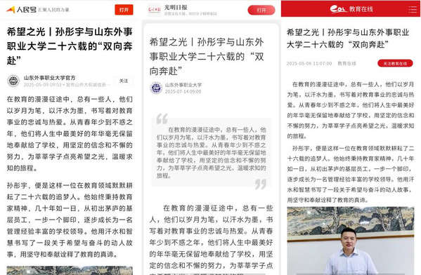 创新宣传载体,讲好育人故事。为使教育家精神可知可感,宣传部聚焦“讲好育人故事”,创新形式,提升宣传的吸引力与感染力。通过精心组织“师者本色—我的从教故事”征文活动,深入挖掘并宣传了一批扎根教学一线的优秀教师典型,其事迹在校报、官网及新媒体平台集中展示,引发师生强烈共鸣。其中,副校长孙彤宇与山东外事职业大学二十六载的“双向奔赴”故事感人心脾,其“乐教爱生、甘于奉献”的仁爱之心,成为教育家精神的生动体现,相关报道全网点赞量超10万次。此外,围绕校级“最美教师(团队)”等选树活动,运用人物通讯、短视频、海报等多种形式,全媒体展现我校教师爱岗敬业、甘于奉献的精神风貌。新推出的“外大新闻”“校园动态”视频新闻栏目,用镜头记录了教师们的温暖瞬间与成就时刻,生动展现了新时代教师的职业风采。